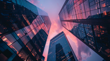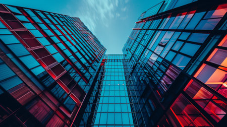 Upward view of modern skyscrapers with vibrant red and blue reflections against a bright sky, showcasing urban architecture.