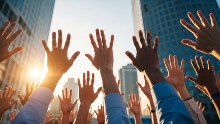 Raised hands, diverse crowd, sun, city buildings