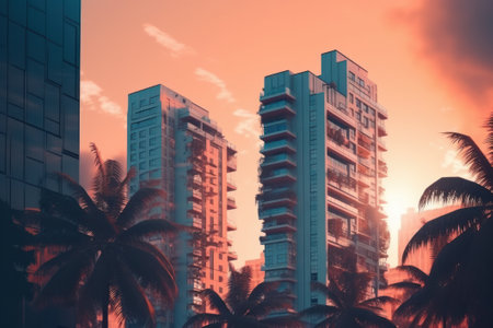 Tropical palm tree and skyscrapers at sunset, vintage tone