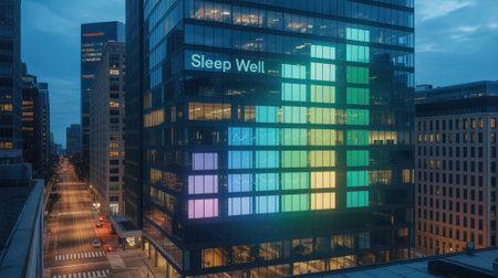 Modern office tower displaying sleep data as bar graph on its facade at night