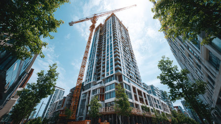 A vibrant urban construction site featuring a tall high-rise building and a crane, surrounded by lush trees and clear blue skies, showcasing modern development.