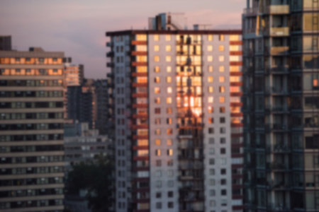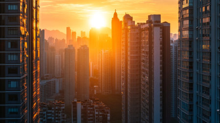 Detailed shot of the sun setting behind a cluster of high-rise buildings, with the suns rays spilling between the structures and creating a beautiful cityscape.