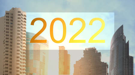 A stunning night view of a vibrant city skyline featuring digital numbers 2026 projected above. The scene showcases illuminated buildings against a dramatic sky.