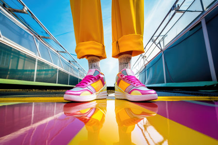 A close up of a person wearing yellow sneakers. Generative AI image.