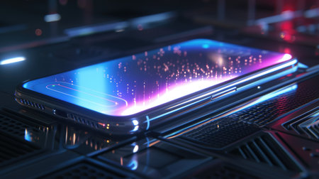 A smartphone placed atop a circuit board, surrounded by vibrant red led lights. this dynamic scene highlights the fusion of modern technology and electronics, ideal for illustrating concepts of communication and innovation. Generative AI