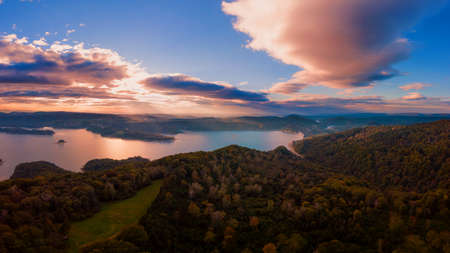 Beautiful panorama of Lake Solina at sunset. Bieszczady, Poland. Aerial view, view from the drone