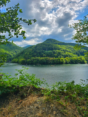 Overlooking the Tarnita Lake on a beautiful summer weekend morning with people doing water sports. Green forest with blue sky and white clouds. Cluj, Romania