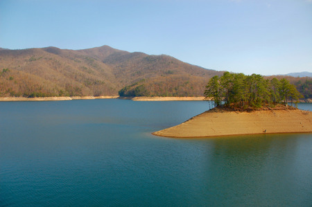 Elevated view of colorful Fontana Lake and Smokey Mountain Range.