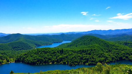 A serene lake surrounded by lush green mountains and a clear blue sky