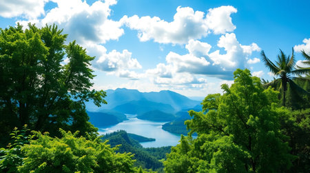 A beautiful scenery of green mountains near a lake surrounded by green trees under the breathtaking sky
