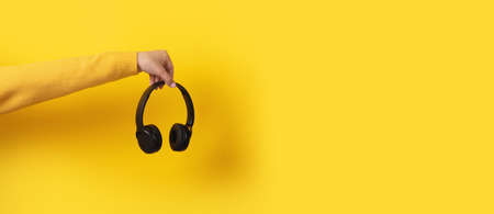 Bright yellow headphones on a black background. A stylish accessory for listening to music.