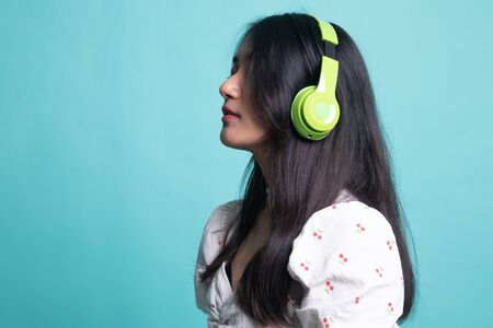 Pretty Asian girl listening music with her headphones in Smart Phone.Mobile