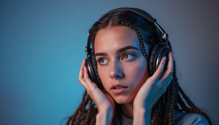 A young woman with braided hair listens intently to music through large headphones, her expression reflecting deep concentration and emotion. The cool blue background enhances the mood, creating a serene atmosphere that invites viewers to share in her musical experience.