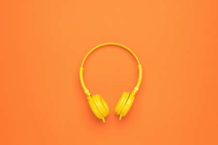 Wireless yellow headphones on a bright orange background. A stylish accessory for listening to music.