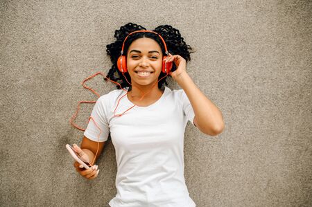 Profile view of young girl with long black hair listening to music in headphones isolated on yellow color studio background