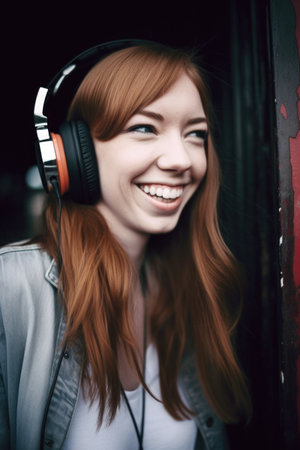 The young girl with a violet hair is seen wearing headphones. Her nose, eyebrows, eyelashes, ears, and jaw are prominent features. She looks cool with the audio equipment, avoiding flash photography