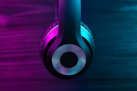 Black headphone on dark wooden background. Stylish wireless headset in neon light.