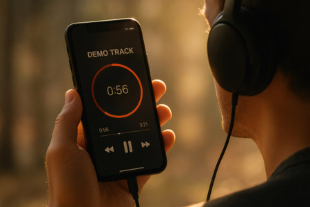 Person holding a smartphone displaying a music player, listening to a demo track through black headphones in warm, glowing sunlight