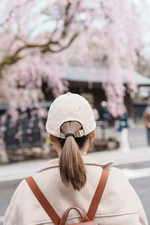 Woman tourist sightseeing Sakura Cherry Blossom in Spring. Happy traveler travel in Samurai village or Little Kyoto in Kakunodate town, Semboku District, Akita Prefecture, Japan. Landmark and Vacation