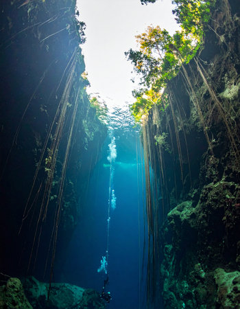 Sunlight shining through an opening in the El Jardin del Eden cenote with a scuba diver in the background.