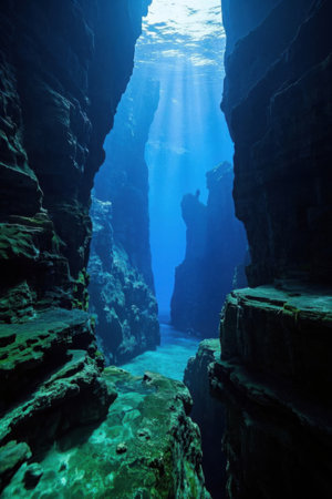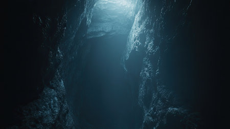 Stunning natural light filters down into an underwater cave, illuminating its mysterious depths and textures.