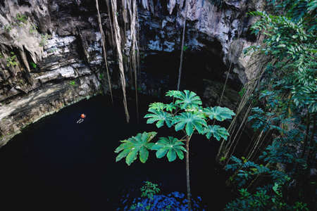 Person with life vest swimming in Oxman cenote with dark blue water and tropical plants in the cave, Yucatan, Mexico