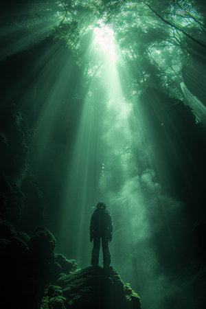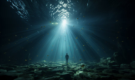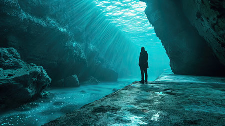A lone diver explores a mysterious underwater cave, bathed in an ethereal light.