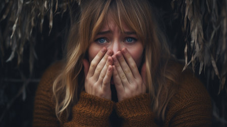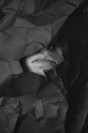 Woman's mouth n hole in black crumpled paper background, black and white concept photography for blog or poster. High quality photo