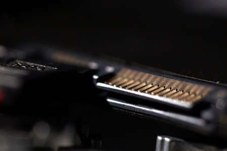 Macro Close up of computer RAM chip; random access memory chip slot for PC motherboard