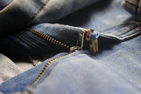 Conceptual Illustation photo, Young Couple Mini figure Toy kissing beyond blue jeans zipper, the key of successful relationship is trust each other