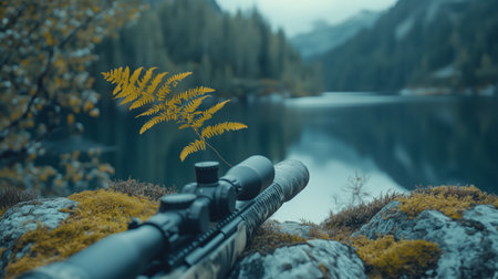 A rifle rests on a moss-covered rock with a backdrop of a tranquil lake and mountains, showing the harmony of nature during early morning light.