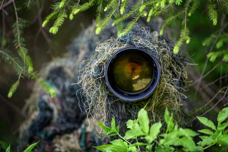 Camouflage wildlife photographer in the ghillie suit working in the wild