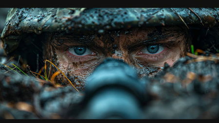 Close-up of a soldier's face with camouflage hat and green eyes peering through leaves