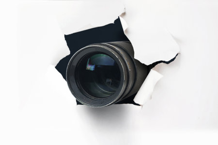 Concept of paparazzi or hidden camera, camera lens looks out through a hole in white paper wall
