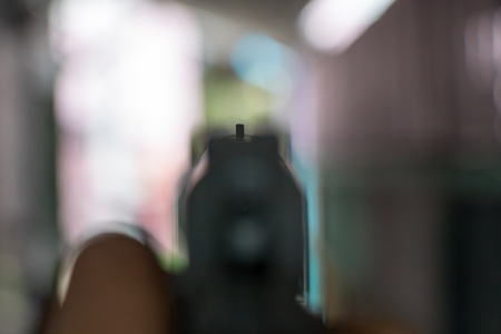 A person aiming and pulling the trigger of a pistol hand gun with background.