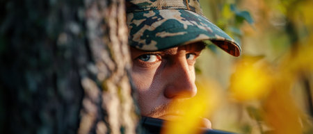 A man in camouflage hat and sunglasses is peeking out from behind a tree. He is holding a gun and he is on a hunting trip