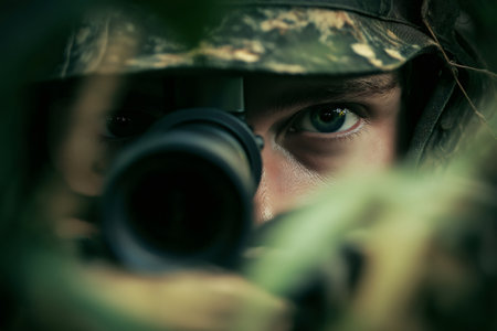 A soldier camouflaged in dense foliage, quietly observing the surroundings during a military training exercise in a woodland setting