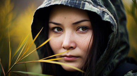 A hooded photographer captures an intense moment with piercing blue eyes and a serious expression showcasing dedication to art.