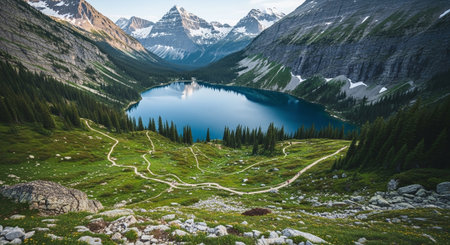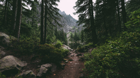 A trail through thick trees guides to a mountain lake surrounded by peaks, providing a backdrop for outdoor adventures.