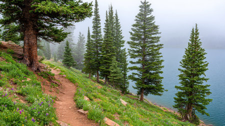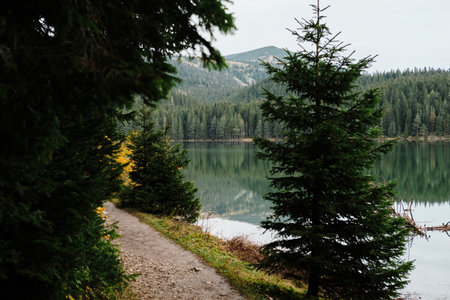 Misty mountain lake with coniferous forest and hiking trail in summer