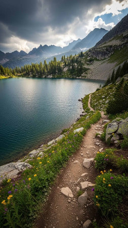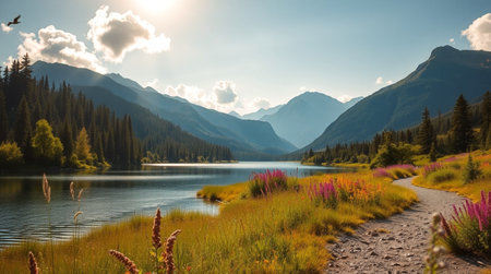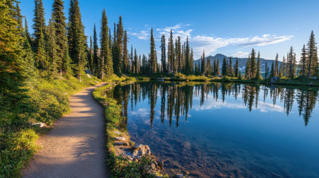 A picturesque nature scene featuring a serene pathway beside a calm lake, surrounded by tall pine trees and stunning mountain views under a clear blue sky.