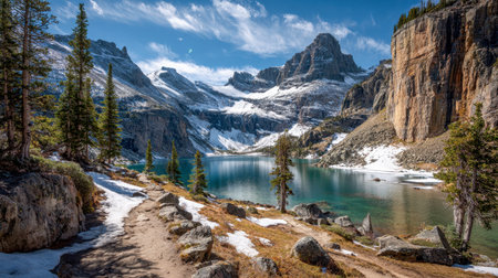 A breathtaking view of a rocky mountain pathway surrounded by lush pine trees and snow-capped peaks. Perfect for nature enthusiasts and adventurers.