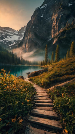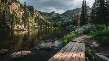 A tranquil mountain lake scene features a wooden pathway leading to calm waters surrounded by lush greenery. A picturesque environment offers a serene escape.