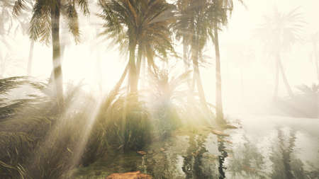 In a tranquil oasis, vibrant palm trees tower over a clear pool of water. The sun illuminates the scene, casting shimmering reflections. Nature's beauty flourishes in this serene paradise.