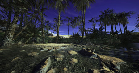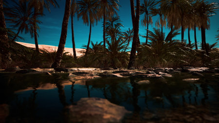Palm trees sway gently by a shimmering oasis reflecting the starry night. Soft winds whisper through the desert as nature reveals its serene beauty, inviting peace and exploration.