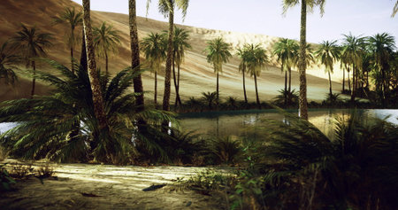 A tranquil oasis surrounded by lush palm trees sits peacefully amid expansive sand dunes. The still water reflects the vibrant greenery under the suns warm glow, creating a serene escape.