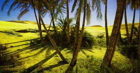 A lush cluster of palm trees thrives amidst golden sands in a desert landscape. The bright colors contrast sharply with the clear blue sky, creating a captivating view.