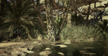 A serene oasis lies quietly among lush palm trees, reflecting tranquility in the clear water. The warm sun casts gentle shadows, creating a peaceful retreat in natures embrace.