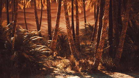Golden sunlight filters through tall palm trees in a vibrant oasis. The warm glow highlights the lush greenery surrounded by sandy dunes, creating a peaceful and tranquil atmosphere.
