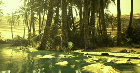 Nestled amidst vast golden sands, a serene oasis beckons with lush palm trees and tranquil waters. This hidden gem shines brightly under the warm sun, celebrating natures beauty.